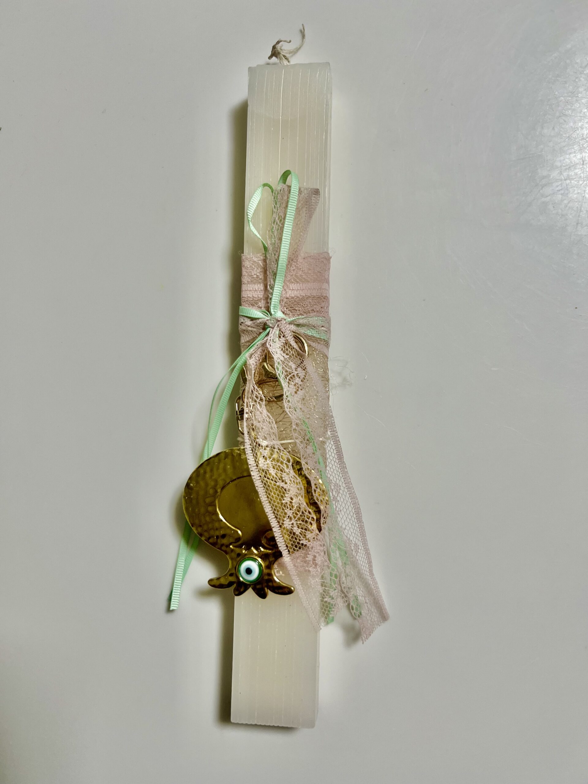 Λαμπάδα πλακέ αρωματική με μπρελόκ ρόδι με μάτι.